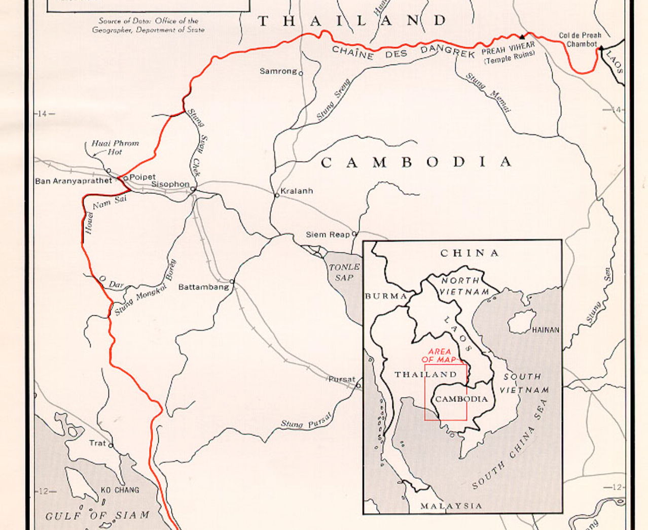 Copying and pasting a previous footnote I used on these maps: Thailand prefers to use the 1:50,000 map, which is more detailed than the Cambodian 1:200,000 map (first developed by French surveyors). As The Nation explains, “In certain areas, Thailand’s maps may show the boundary passing through one location, while Cambodia’s maps indicate it lies hundreds of metres—or even several kilometres—away.”