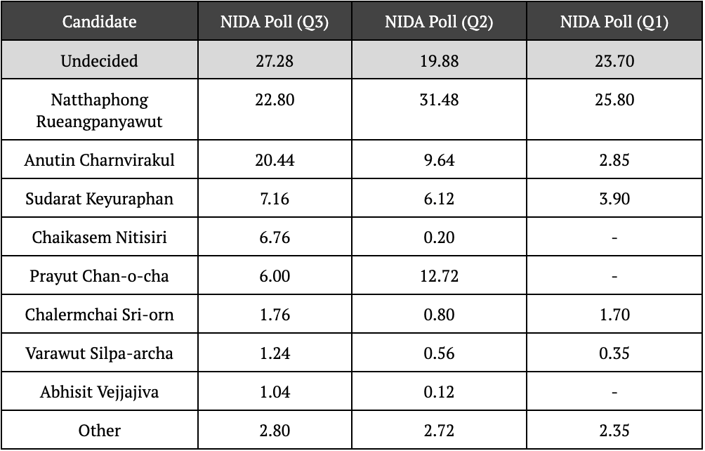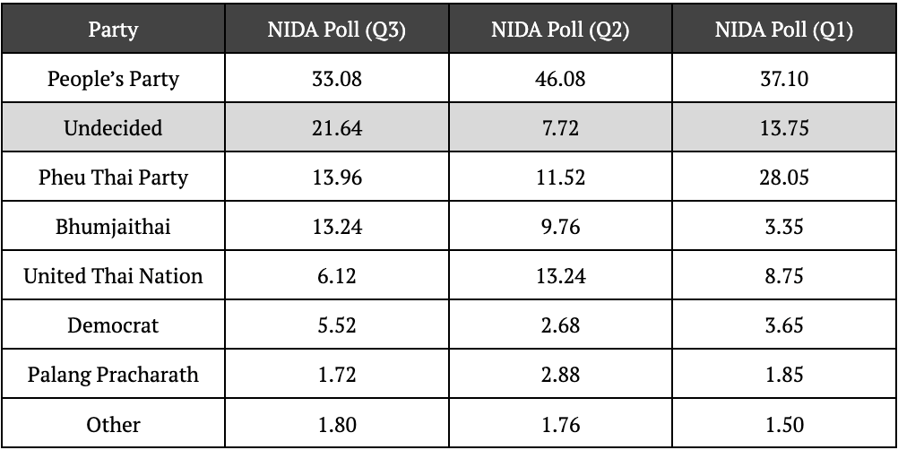 We also have a recent Suan Dusit Poll that was conducted between 9-12 September which found the People’s Party polling at 23.94%, Pheu Thai polling at 11.61%, Bhumjaithai polling at 14.20%, Palang Pracharath at 10.39% the Democrats at 3.17%, 18.51% selecting other parties, and 21.35% undecided.