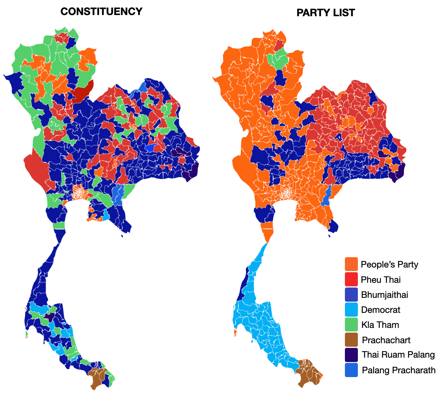What are those rationales? To make sense of split ballot results, we have generally treated constituency results as reflective of local attitudes (“this MP has performed exemplary service in my locality and deserves to be re-elected”), while party-list results are seen as a proxy for genuine ideological attachments or national sentiments (“I agree with this party’s policy platform and want their candidate for prime minister”). This often leads to contradictory voting decisions, where a voter might pick the People’s Party on the party-list ballot but vote Bhumjaithai on the constituency ballot — even though they do not see eye to eye on many fundamental issues and would have been unlikely to form a government together. This was certainly the case in 2023, when Move Forward was the most popular option on the party-list in 70 constituencies won by the major conservative parties (United Thai Nation, Palang Pracharath, and Bhumjaithai).