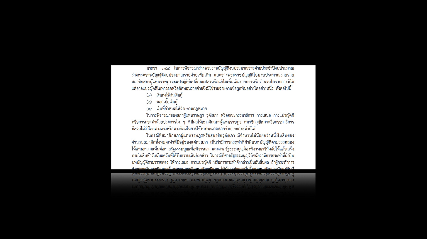 As the Bangkok Post writes, according to the petitioners, “The House committee scrutinizing the budget acquiesced despite the constitution prohibiting such action…Section 144 of the constitution prohibits the slashing of budget allocations used to fulfill legal obligations, particularly allocations set aside for debt payment to banks under Section 28 of the Financial and Fiscal Discipline Act.” In addition, “another 1.25 billion baht was diverted from the central fund to a fund for former parliamentarians, which violated Section 144 (2) of the constitution, which prohibits MPs or senators from diverting budget allocations for personal benefits.”