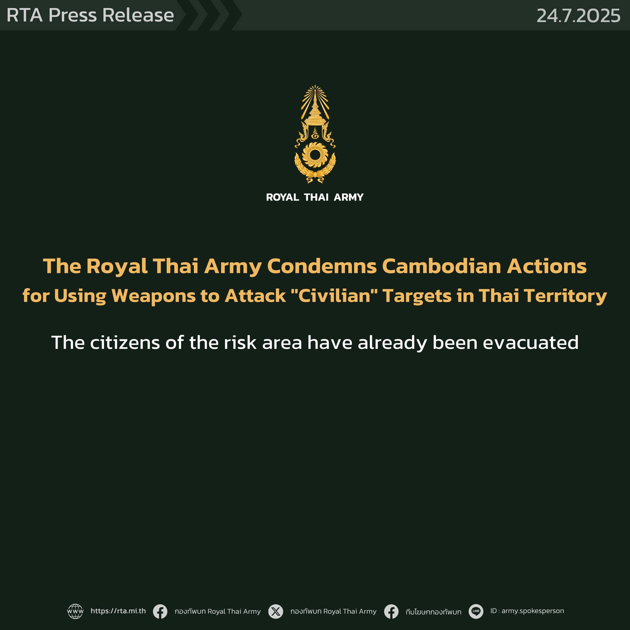 Cambodia disputes this account and claims that the Thai army opened fire first. In response to these claims, the Royal Thai Army has released a detailed account. The RTA has been using the hashtag #CambodiaOpenedFire on social media.