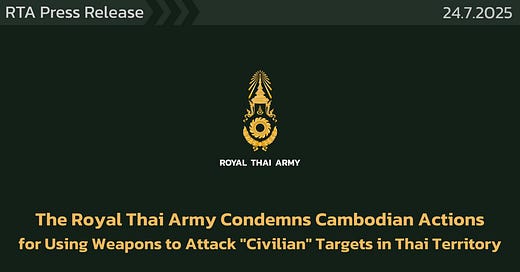 Secondly, we still do not know how the escalation of this conflict will impact Thai domestic politics moving forward. Thailand is in a curious situation — it is now in a military conflict with no real prime minister (Paetongtarn Shinawatra remains suspended) and no defense minister (Deputy Defense Minister Natthaphon Narkphanit is serving in an acting capacity). In short, Thai politics is at its most dysfunctional right now. As if to demonstrate this state of disarray, “national clerk” Thaksin Shinawatra personally accused Hun Sen in a tweet of ordering the attacks and proclaiming that the Thai army “can respond in accordance with military plans with legitimacy". (It comes awfully close to sounding like he was giving instructions to the military).2