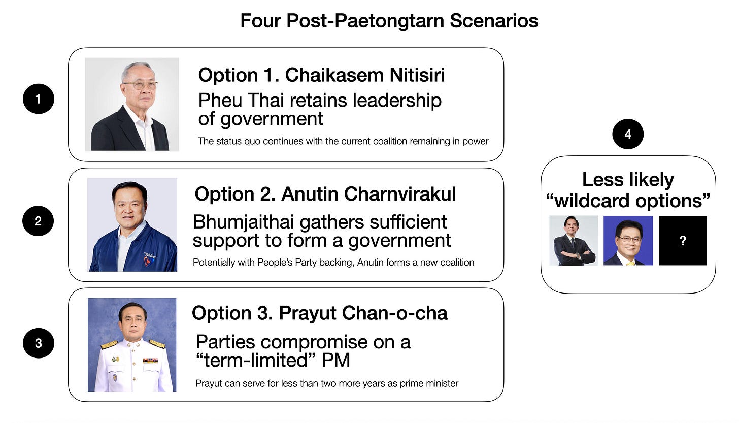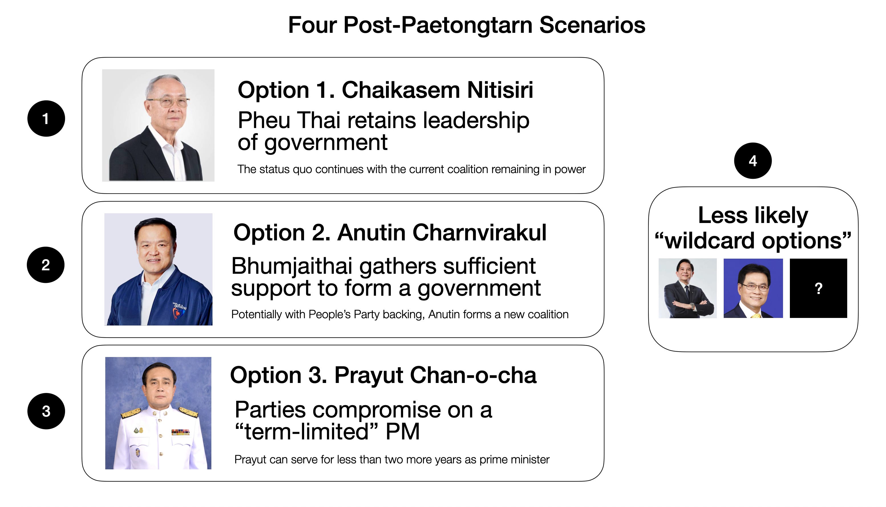 What happens next? For the third time in the current parliament, we’re back to analyzing who will become the next prime minister. I’ve listed out four possible scenarios for the post-Paetongtarn political landscape.