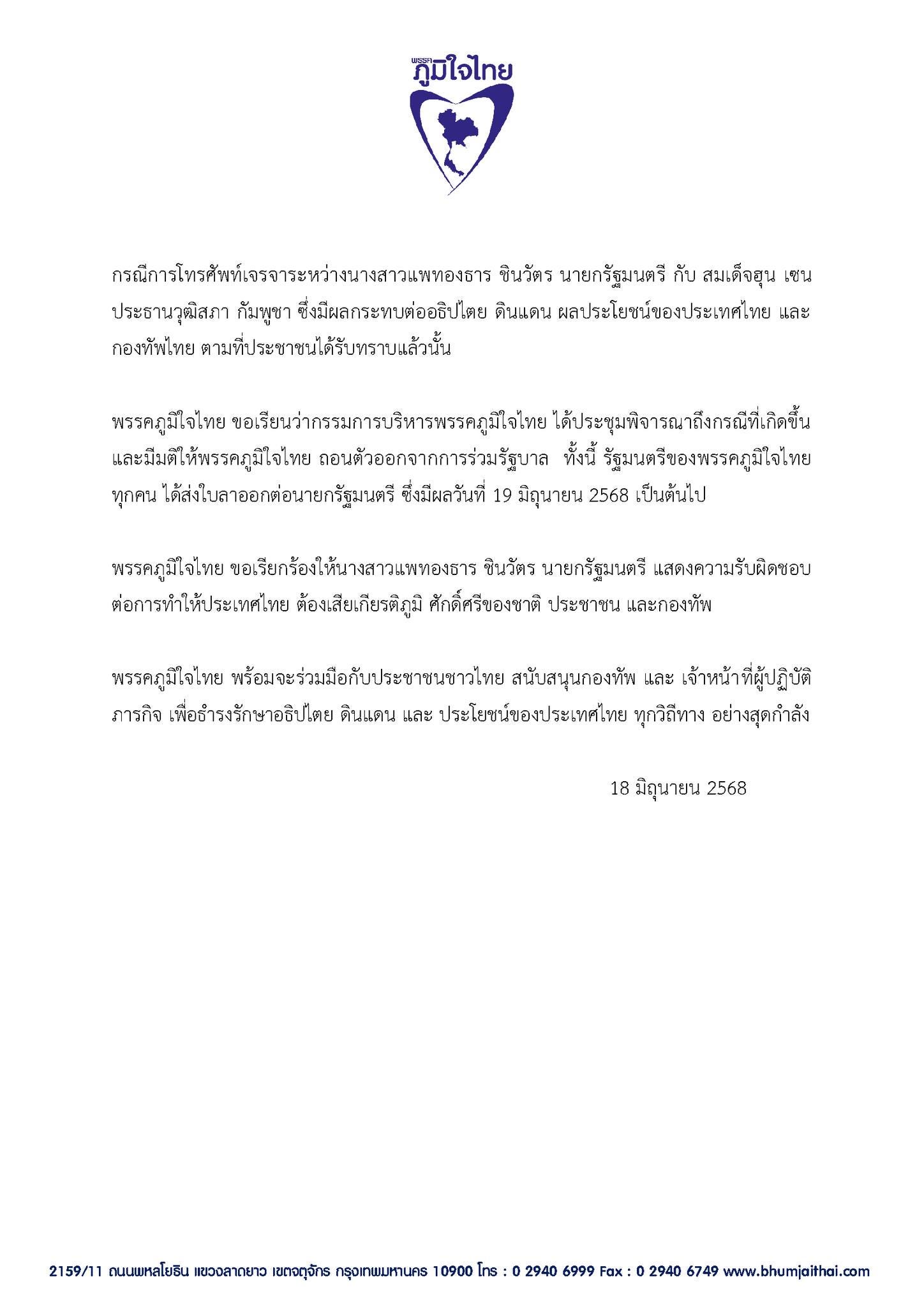 But the furor over the call — we do not know if Anutin knew its contents in advance — made for some impeccable timing. Bhumjaithai released a statement officially announcing that its party executives had voted to leave the coalition, not over losing control of the Interior Ministry, but because of Paetongtarn’s phone call. “The Bhumjaithai Party calls on Prime Minister Paetongtarn Shinawatra to take responsibility for causing Thailand to lose the honor and spirit of the nation, people, and army,” the statement said.