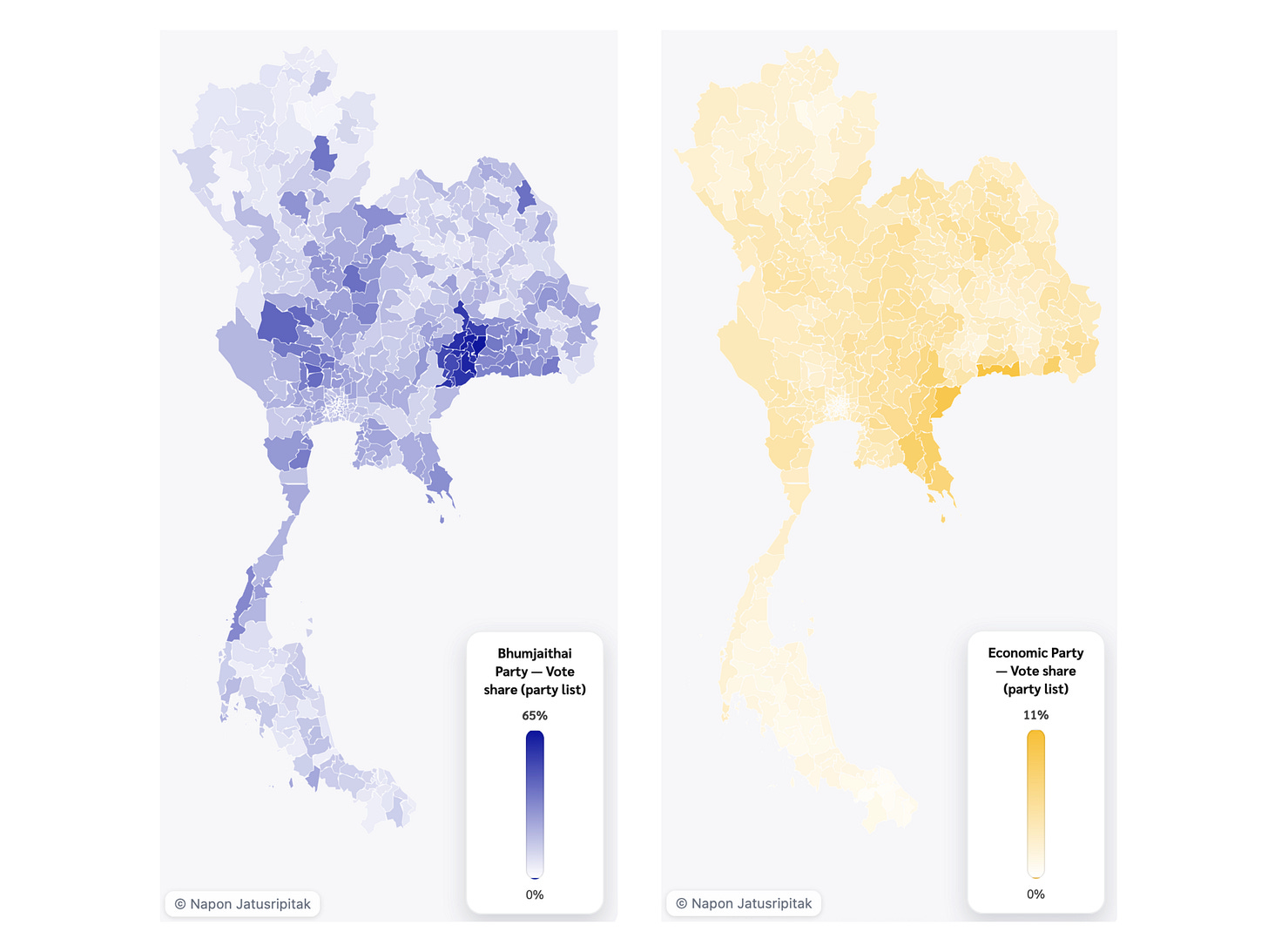 Last month, Joel Selway on Thai Data Points discussed the question of whether Bhumjaithai’s victory had been driven by nationalism. I encourage you to read the full piece, but the gist of his argument is that while nationalism likely played a role in motivating voters already predisposed towards Bhumjaithai, coordination in local races was the more important determinant of victory.